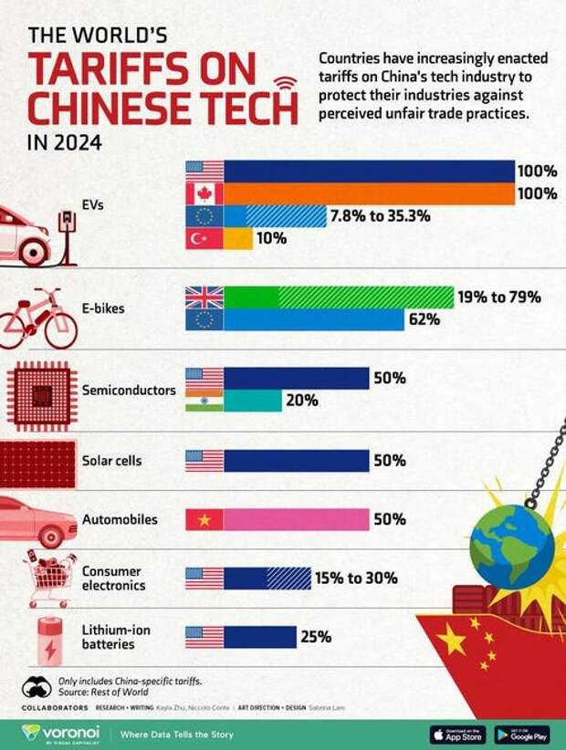 This chart, via Visual Capitalist's Kayla Zhu, shows China-specific tariffs imposed by countries on products from China’s tech sector.