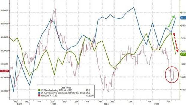 After rallying to multi-year highs in June, the preliminary July print for S&P Global's US Manufacturing PMI tumbled to 49.5 - its lowest level of the year.