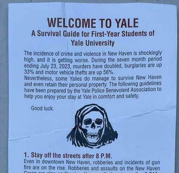 Presented by the Yale Police Benevolent Association as “A Survival Guide for First-Year Students of Yale University,” the flyers were distributed on freshman move-in day. “The incidence of crime and violence in New Haven is shockingly high, and it is getting worse,” the flyers warned. “During the seven month period ending July 23, 2023, murders have doubled, burglaries are up 33% and motor vehicle thefts are up 56%.”