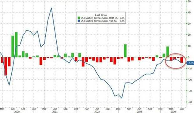US existing home sales slumped for the fourth straight month in June, plunging a worse than expected 5.4% MoM (the worst MoM drop since Nov 2022) and dragging sales down 5.4% YoY...