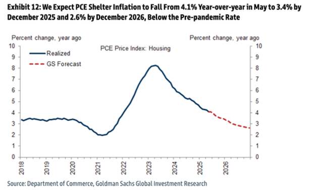 - With rent growth slowing to 2–3% and the rent gap between new and existing leases now closed, Goldman expects PCE shelter inflation to fall from 4.1% to 2.6% by December 2026.