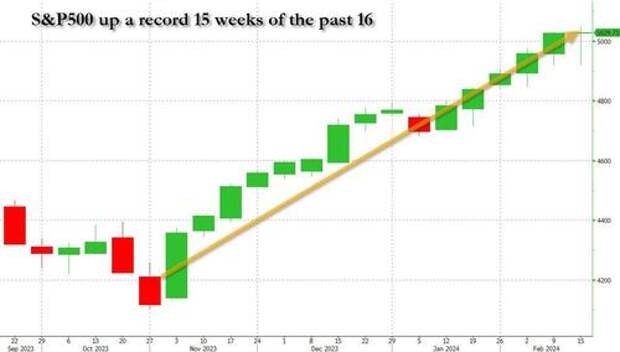 Meanwhile the latest bubble euphoria just won't stop, as US equity funds registered inflows of $11 billion in the week through Feb. 14, the most in seven weeks, according to Bank of America. On the downside, breadth of the S&P 500 is currently the weakest since 2009 as the top five stocks in the index have fueled 75% of its gain so far this year, according to the Bank of America report.