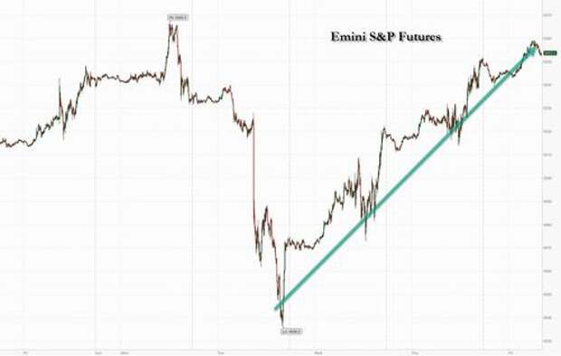 2% - amid bigger gains in European stocks ...... and were on pace to dodge a weekly red candle in the process setting up a record 15th weekly gain of the past 16, as the market no longer drop. Ever. Meanwhile, the euphoria was even more ridiculous over in tech world where Nasdaq futures accelerated their silly meltup, rising 0.5%, propelled by Applied Materials rising ~13% in premarket trading while the current generation's Gamestop, Supermicro, was up another 6% premarket, sending its RSI to a record 98.