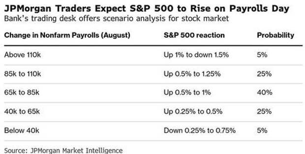 August payrolls are projected to rise by roughly 75,000, extending a four-month streak of job growth below 100,000. The unemployment rate is seen climbing to 4.3%, the highest since 2021 (our full preview is here). JPMorgan Market Intel estimates a better than 90% chance that the S&P 500 will advance following the payrolls report. Although the data is unlikely to sway the September decision, a weaker-than-expected print could amplify calls for a 50 basis-point cut, the team led by Andrew Tyler noted earlier this week. While softer numbers may briefly stoke recession fears, the bank notes that the real risk lies in a substantially stronger-than-expected report.