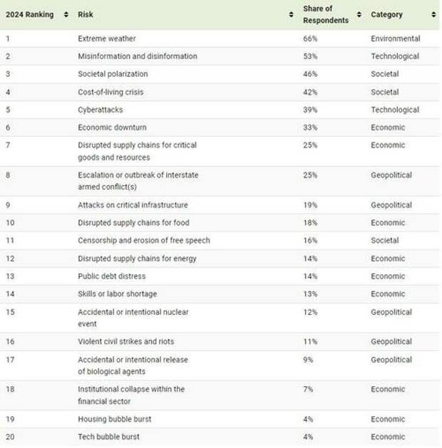 Leaders were asked to choose up to five risks that are likely to present a material crisis on a global scale in 2024:\