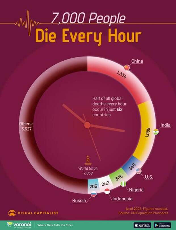 These numbers reflect the impacts of aging, illness, and conflict, and Visual Capitalist's Pallavi Rao takes a further look into the countries with the most deaths every hour.
