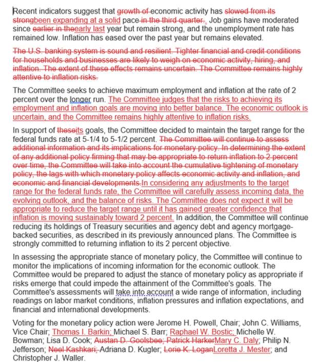 The FOMC voted unanimously to leave benchmark rate unchanged - as expected - in target range of 5.25%-5.5% for fourth straight meeting while making significant changes to statement