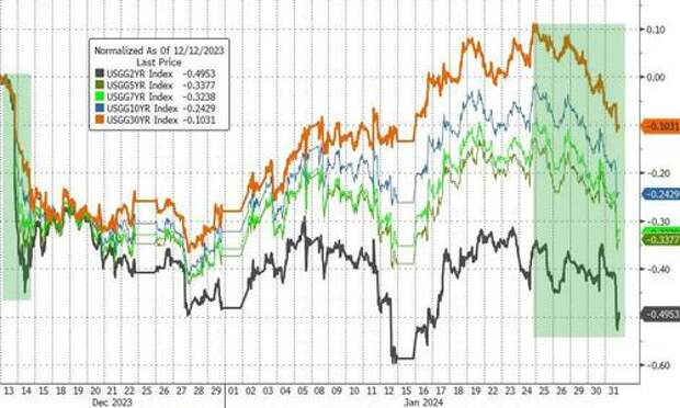 While all yields are lower since the last FOMC meeting, the short-end has dramatically outperformed (with the last few days rescuing the long-end). The curve has steepened dramatically with 2s30s swinging from -45bps to +10bps since the last meeting...