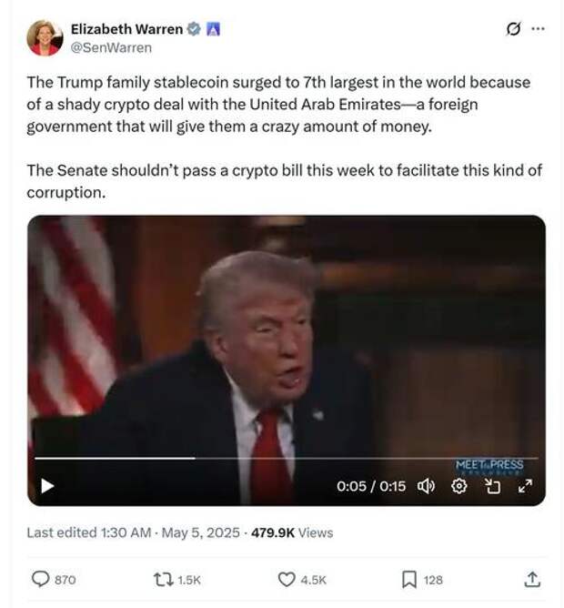 As Amin Haqshanas reports via CoinTelegraph.com, in a May 5 letter to the Office of Government Ethics, Senators Elizabeth Warren and Jeff Merkley said that Trump and his family stand to personally profit from an investment involving UAE state-backed firm MGX, crypto exchange Binance and World Liberty Financial (WLFI).