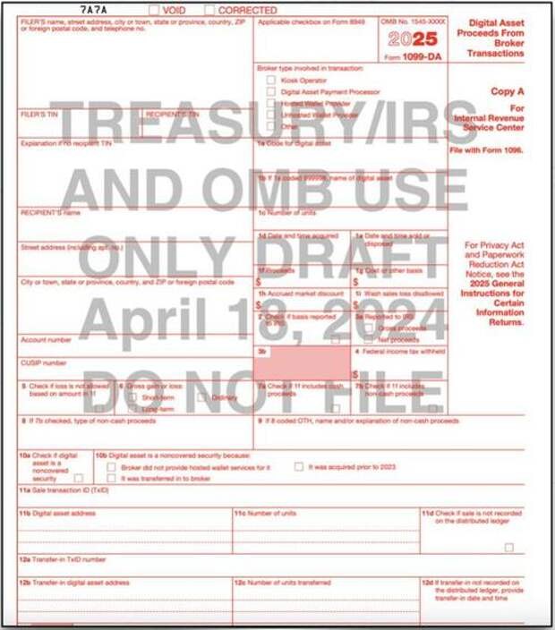 The proposed new 1099-DA tax form to report “Digital Asset Proceeds From Broker Transactions” was released via the IRS website: