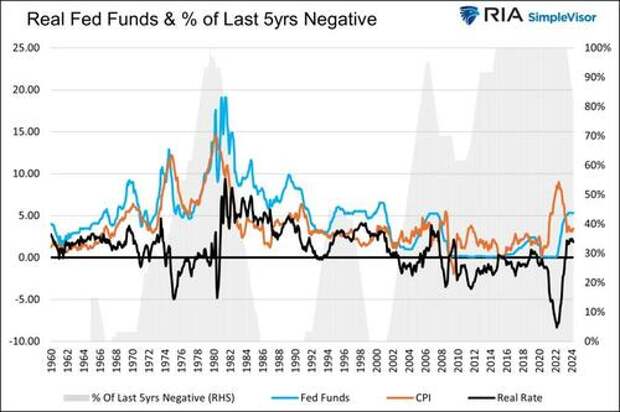 Regardless of what should happen in an economics classroom, the Fed has forced a negative real rate regime upon lenders and investors for the better part of the last 20+ years. The graph below shows the real Fed Funds rate (black). This is Fed Funds less CPI. The gray area shows the percentage of time over running five-year periods that real Fed Funds were negative. Negative real Fed Funds have become the rule, not the exception.