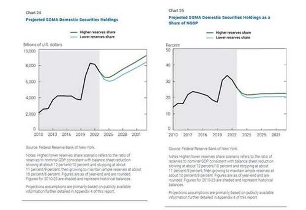“Under the two purely illustrative scenarios, the size of the SOMA portfolio continues to decline to $6.5 trillion and $6.0 trillion, respectively. The portfolio size then remains steady for roughly one year before increasing to keep pace with growth of demand for Federal Reserve liabilities, reaching $9.2 trillion and $8.4 trillion, respectively, by the end of the forecast horizon in 2033.”