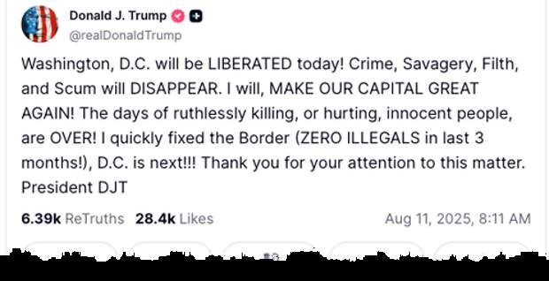 Earlier, President Trump fired off a Truth Social post around 8:00 a.m. ET: "Washington, D.C. will be LIBERATED today! Crime, savagery, filth, and scum will DISAPPEAR. I will MAKE OUR CAPITAL GREAT AGAIN!"