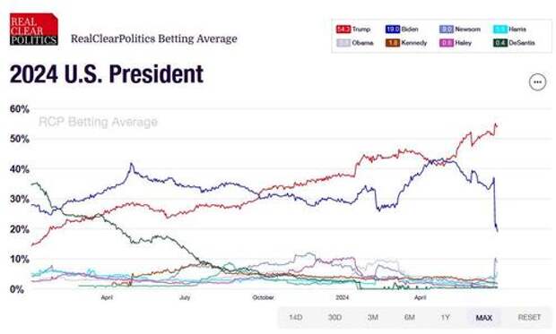 - Based on betting data, we saw President Biden’s odds decline, noticeably, but former President Trump’s odds increased marginally. Basically, the betters were taking chips off the Biden table, and spreading them around, not just throwing them all to Trump. I used RealClearPolling (the link seems ok, but I wouldn’t bother clicking it without a good VPN). It seemed comprehensive and in line with other reports I’ve seen. I do not know how easily manipulated the betting markets are (e.g., depth of liquidity). So, you can take this with a grain of salt, but I do think that we’ve seen a change in how people are thinking about the upcoming election.