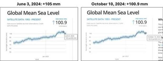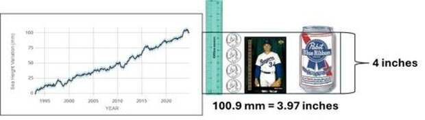 According to NASA sea level has risen by 100.9 mm since 1993. That’s almost four whole inches!!! Enough to swamp four quarters or a baseball card or even a beer can!