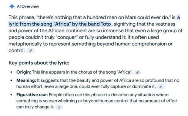 AI is a long way from Skynet I Googled my favorite garbled lyric from the Toto song Africa: “There’s nothing that a hundred men on Mars could ever do.” The Google AI confirmed my garbled lyric:
