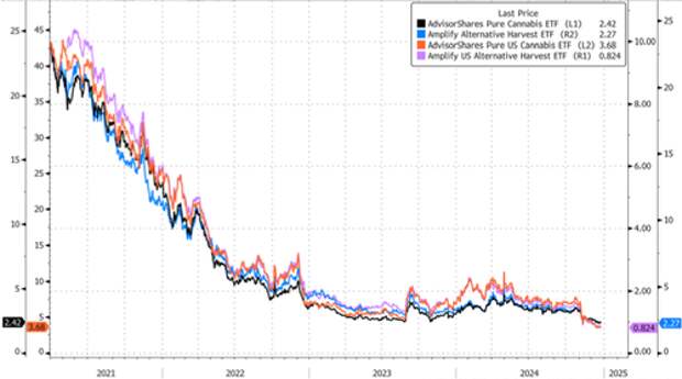 In markets, some of the top marijuana ETFs, including AdvisorShares Pure US Cannabis ETF (MSOS), Amplify Alternative Harvest ETF (MJ), AdvisorShares Pure Cannabis ETF (YOLO), and Amplify US Alternative Harvest ETF (MJUS), have been battered since the marijuana stock bubble unraveled in early 2021.