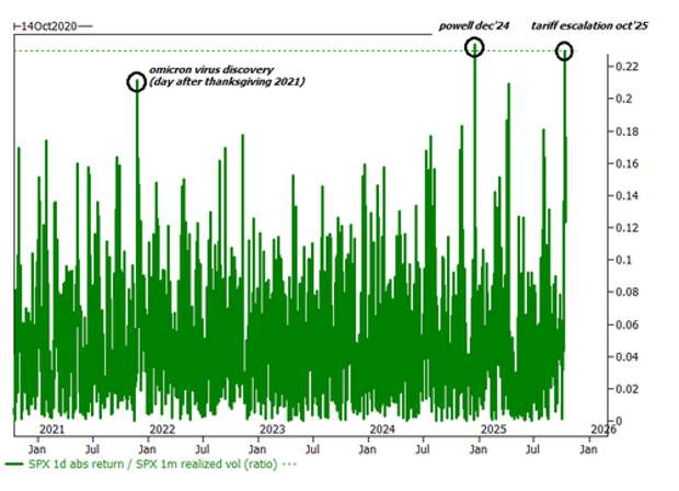 What made the drop especially remarkable is that it took place in an extremely complacent context, with realized vol at the lowest level in years.