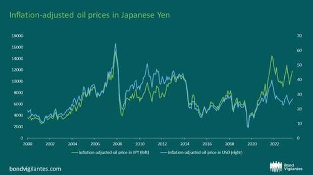 Prices could double from here before having a meaningful impact on the US. The moderate price of Oil is no doubt contributing to some of the strength that we currently see in the US. This does, however, bring up an interesting dynamic. As we know, oil is priced in US dollars, and countries other than the US are hostage to the price of oil in dollars. Looking at the cost of oil in a foreign currency tells a very different story. The chart below looks at the inflation adjusted price of oil in JPY: