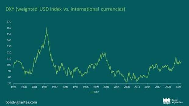 In fact, just recently, the US, Japan and South Korea met to “consult closely” on currency markets. What exactly this means is unclear, but it is very interesting. Speculation is rife about whether Japan recently intervened in currency markets as the yen hit 160 to the dollar. Are we inching towards a new Plaza Accord? The stresses and strains don’t look particularly stretched when you compare the DXY ( a weighted dollar index versus international currencies) from 1985 to today, so a new Plaza Accord may be some way off: