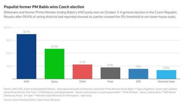 It was also another booming stamp of disapproval for the EU's policies.An ebullient Babis, also known as the Czech Trump - for being a septuagenarian billionaire campaigning on a populist message and passing out red caps to ardent supporters - told supporters that ANO would seek a one-party cabinet but would talk with two small parties - including the far-right SPD - for support as his party will lack an outright majority. He again rejected accusations that his win would make the central European nation a less reliable European Union and NATO partner.