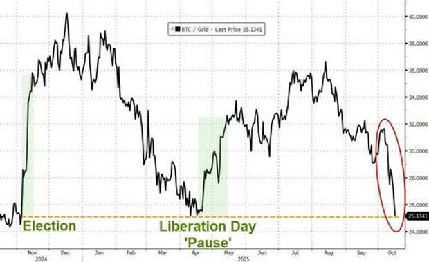 Bitcoin is crashing. It just dropped below $112,000. In terms of gold, Bitcoin is now down over 25% from its record high set in August. It still has a long way down to fall.