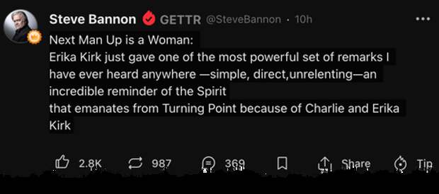 Commenting on Eirk's powerful speech, Steve Bannon wrote on Gettr, "Next Man Up is a Woman: Erika Kirk just gave one of the most powerful set of remarks I have ever heard anywhere —simple, direct,unrelenting—an incredible reminder of the Spirit that emanates from Turning Point because of Charlie and Erika Kirk. "