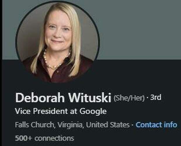 Deborah Wituski joined Google in 2018 as Senior Director Global Intelligence. Her only prior work experience was 19 years at the CIA, where she was Chief of Staff to the Director. Wituski is a member of Council on Foreign Relations.
