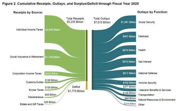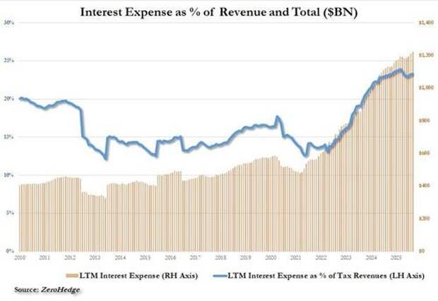... which is a problem, because tariffs or not, DOGE or not, the US spends 23 cents of every dollar in revenue collected to pay down just the interest on debt...