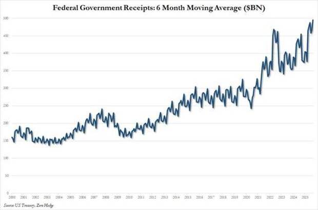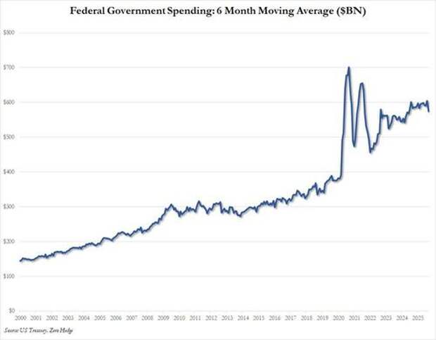 On the outlays side, here too there were notable improvements, with the US government spending only $346 billion, a sharp from from the $689 billion in August, and down a whopping 25% from the $463 billion last September. Even more remarkable is that the six month moving average of govt spending suddenly slumped from $604 billion - the highest since covid - to $573 billion, the lowest since June 2024. Yes, the improvement may be small, but every little bit helps and whatever Trump is doing to shrink govt spending is starting to show.