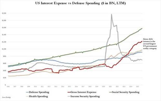 ... means that the US interest expense continues to be the most dangerous, and rapidly rising, spending category of all: to wit, at $1.22 trillion in the past 12 months, gross interest expense is less than $400 billion away from catching up to Social Security Spending.