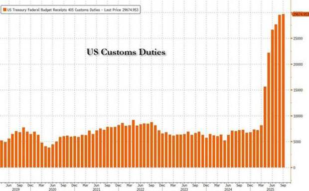 A big reason for the stellar September surplus is that tariff collections continued apace, and in September the US government collected a record $29.7 billion in tariffs, which translated in a record $195 billion for the fiscal year. And since Trump's tariff regime was only active for 6 of the past 12 month, expect tariffs to deliver about $350 billion in annual revenue every year, unless they are canceled.