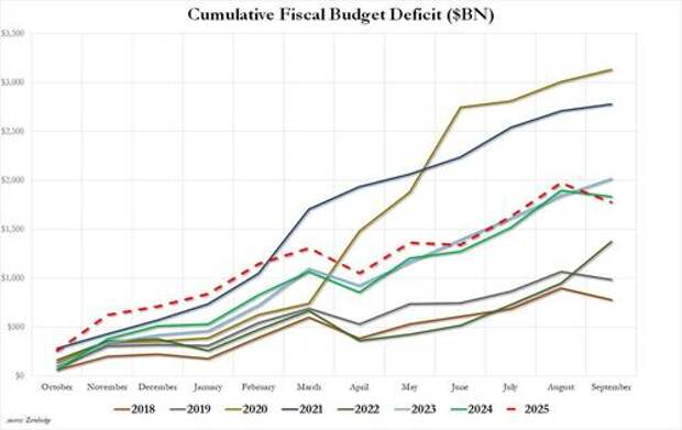 ... resulting in a full-year deficit of $1.775 trillion which while still high, managed to stage an impressive reversal in recent months. As shown below, until a few months ago, 2025 was set to surpass both 2023 and 2024 in terms of the total deficit. And yet, in September, the belt-tightening meant that the cumulative full year deficit shrank enough to improve on both 2023 and 2024!