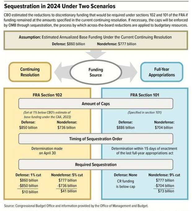 April 30: This date is in play if there is another clean continuing resolution that punts the decisions further. This is the lead chart, discussed below, in which spending caps will be enforced by sequestration, across-the-board reductions applied to budgetary resources as set by the Fiscal Responsibility Act of 2023.