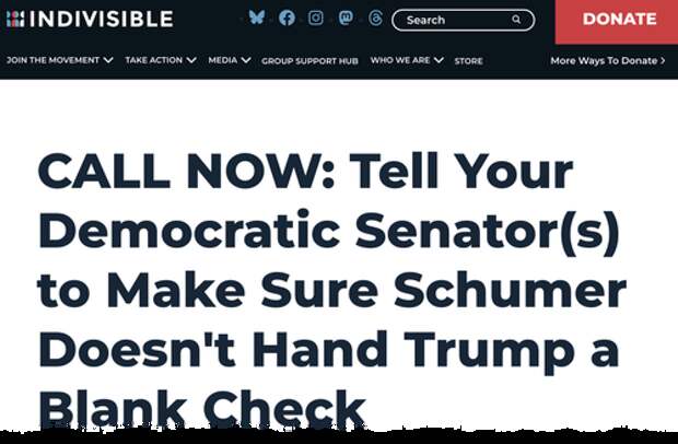 Y.) and other Democratic senators not to concede to President Trump, thereby voting against government funding and triggering a partial shutdown."CALL NOW: Tell Your Democratic Senator(s) to Make Sure Schumer Doesn't Hand Trump a Blank Check," far-left activist group Indivisible wrote on its website.