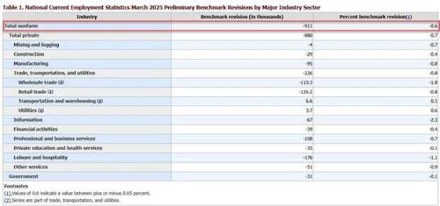 ... and just like one year ago when we did exactly the same, we were spot on: moments ago the BLS reported that as part of its preliminary annual benchmark revisions, a record 911K payrolls for the period April 2024-March 2025 would be revised away. As shown in the chart below, the biggest revisions were in Leisure and Hospitality, Professional and Business services, and Retail and Wholesale trade sectors.