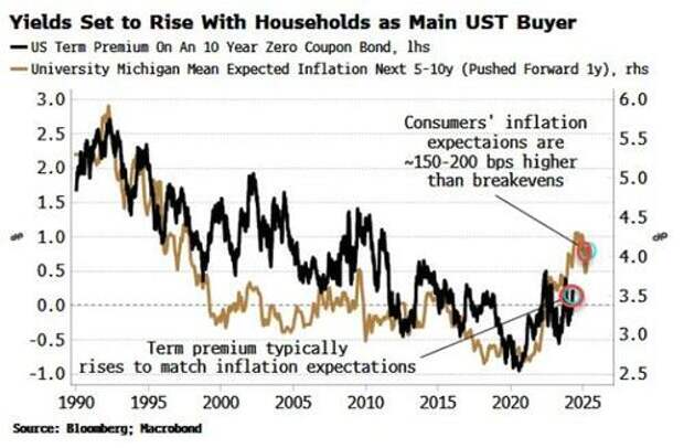 Households have become the de facto buyer of last resort for Treasuries. But there’s nothing to suppose they’ll be happy to continue to do so at any price. As the chart below shows, consumers’ long-term inflation expectations typically lead term premium. The market’s view of longer-term inflation, i.e. breakevens, is about 150-200 basis points lower than households’ outlook. As the UST buyer of last resort, households will increasingly set the price, one that’s likely to be lower than it is now.