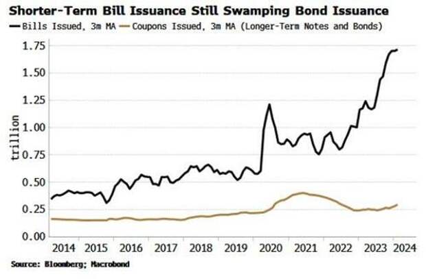 The increase in bill issuance over the last year or so has been of immense importance to markets. The “Yellen pivot” meant that liquidity lying idle in the RRP could be used by money market funds to buy bills and thus help fund the government.