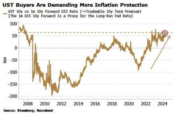 The chart below shows a tradeable proxy for term premium - the difference between the 10-year yield and the 1-month OIS rate 10-years forward - that is as high it’s been since the GFC.