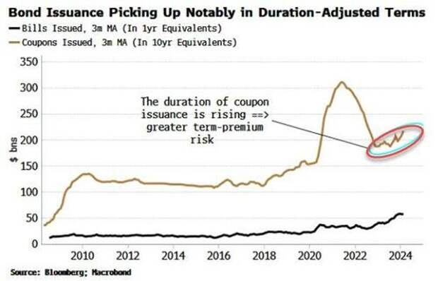 But in duration-adjusted terms the picture is already changing. The amount of coupons issued adjusted for duration is rising. That will amplify the move higher in term premium and ultimately jeopardize support for risk assets.