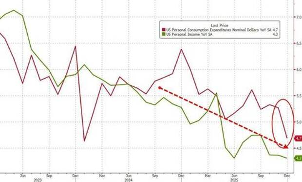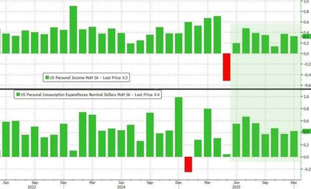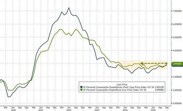 The Fed's favorite inflation indicator - Core PCE (a measure of price changes in consumer goods and services that excludes volatile food and energy costs) - rose 0.4% in December (the latest data released today), slightly hotter than expected (+0.