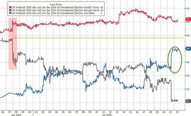 President Biden's removal from the ticket for the 2024 election sent Kamala Harris odds of winning in November soaring (but we note she remains below the pre-debate levels that Biden had reached)...