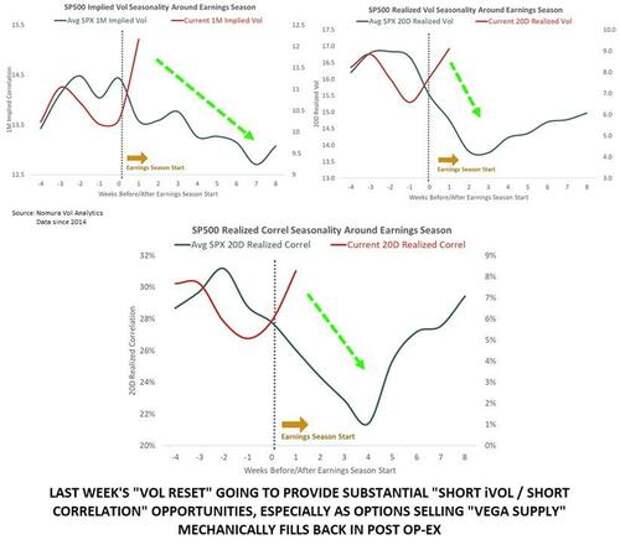 And all of these “calming” inputs most critically are occurring into the “meat” of Earnings season kicking-off with big Tech releases concentrated over the next two weeks, which, as McElligott notes, means we tend to see a large “Dispersion” effect, as Correlation goes lower (Earnings “winners and losers” going in opposite directions) and contributing to further Vol decline…while too, the “mechanical” overwriting and systematic “Vega supply” has not changed either, as the assets keep doing their thing...
