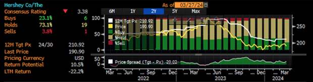 Bloomberg data shows there are 6 "buys," 19 "holds," and 1 "sell" on Hershey.