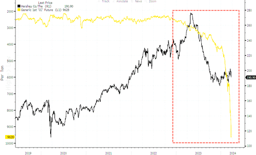 BNP Paribas Exane's Max Gumport wrote in a note to clients that his recommendation on Hershey was cut from "outperform" to "neutral" on the thesis that cocoa inflation is "Not So Transitory."