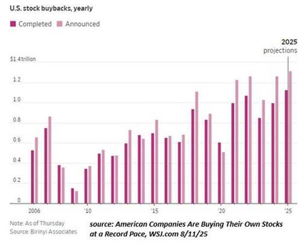 The approved narrative seems to be that Corporate America would be investing these trillions in new productivity, except for all this uncertainty about tariffs. But this explanation conveniently ignores the enormous annual buybacks that preceded the present tariff kerfuffle.