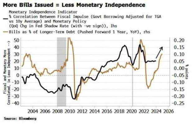Look no further than Wednesday to see monetary independence’s erosion and fiscal dominance’s re-ascendancy play out in microcosm. A rate-setting meeting would normally be top billing for the market, but the Fed is likely to be overshadowed by the Treasury’s refunding and auction-size announcement on the same day. The wind is changing.