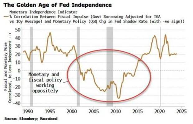 The Monetary Independence Indicator (MII) for the US, shown below, is the correlation between the change in government borrowing and the change in the Fed’s Shadow Rate (so as to include the effects of QE). As we can see, the golden age of Fed independence was from the late 1990s to the mid 2010s, when monetary policy acted contrary to its fiscal counterpart.