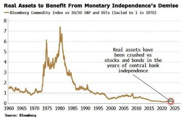 A less independent Fed and a spendthrift government is structurally inflationary. This means the end of the nominal Fed put – a backstop for financial assets, i.e. stocks and bonds – as elevated inflation eats away at real values. Elevated inflation will thus make real assets, such as commodities, increasingly attractive, reversing their decades of extreme underperformance.