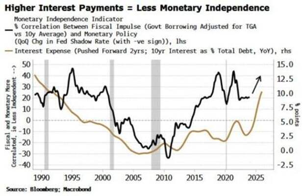 Overlaying US interest expense on to the MII shows that when the interest bill is high it leads to a rise in the latter, signifying the Fed is acting less independently, and vice-versa. Today’s rise in interest costs shows the Fed’s independence will be increasingly constrained.